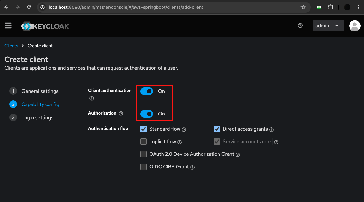 [2] 보안 설정: 여기서 디폴트로 Client authentication과 Authorization 옵션이 Off로 되어있는데 이를 On으로 바꿔줘야 Credential 탭이 생겨서 Client Secret을 생성할 수 있다.