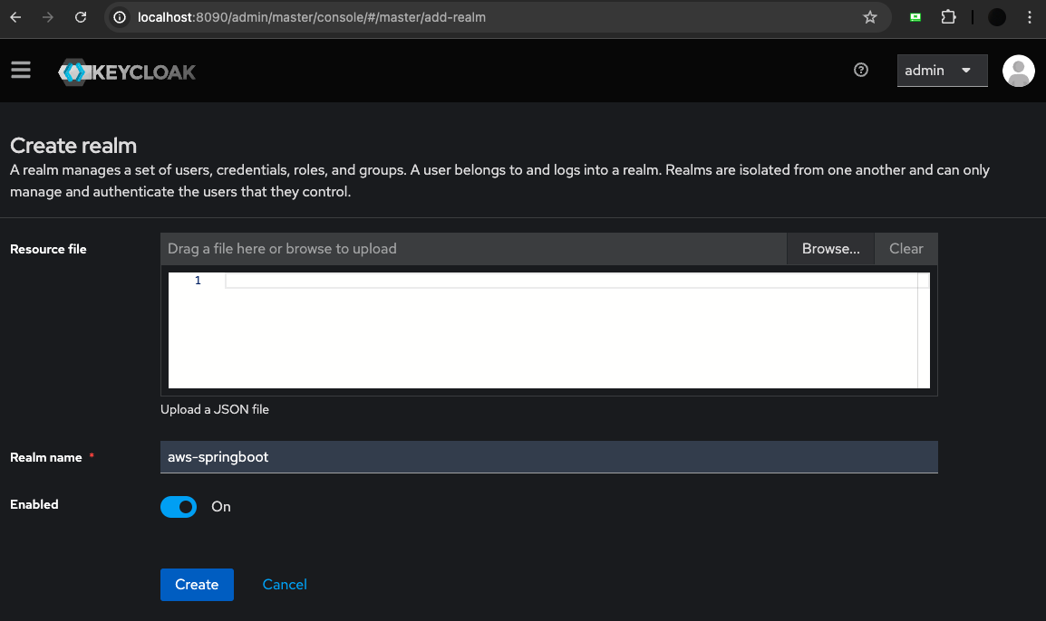 Realm에 등록한 모든 Client에 대해 SSO가 적용되기 때문에 SSO를 적용하고 싶은 모든 서비스를 묶어서 하나의 Realm에 묶어 넣어준다고 생각하면 된다. 우선 실습을 위해 aws-springboot라는 realm을 생성해 줬다.