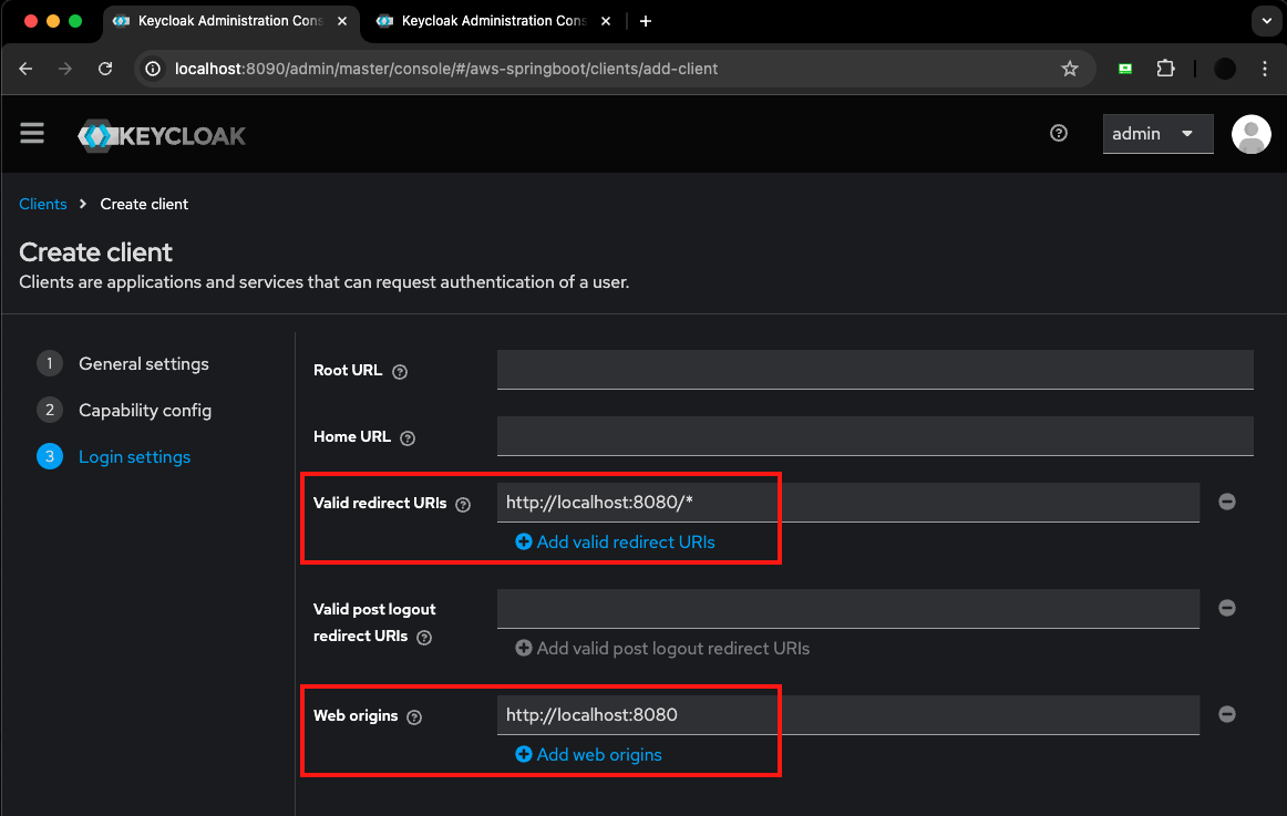 [3] 로그인 시 리다이렉트 될 URI 지정: 스프링부트가 로컬호스트 8080에서 동작하므로 다음과 같이 지정해 준다.