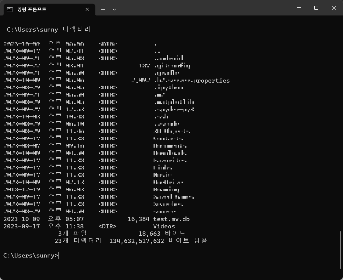 + 리눅스와 다르게 디렉터리의 파일들을 조회하려면 'ls'가 아닌 'dir'을 입력해야 한다.