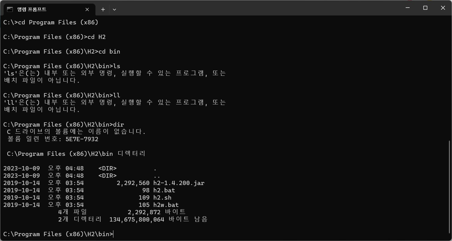 이후 cd 뒤에 위 경로를 작성하면 bin 디렉터리 안에 h2.bat 파일을 찾을 수 있다.