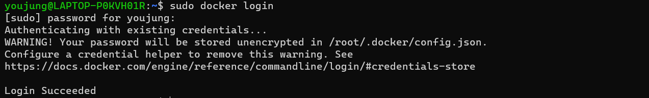 명령어를 입력하면 도커 허브에 가입했던 Username과 Password를 입력해서 로그인을 할 수 있다. 한번 로그인해 두면 existing credentials에 로그인 정보가 저장돼서 편리하다. 또한 나의 경우에는 docker 명령어를 사용할 때 sudo를 붙이지 않으면 permission error가 발생했다. 그러므로 모든 도커 명령어마다 sudo를 꼭 붙여야 했다.