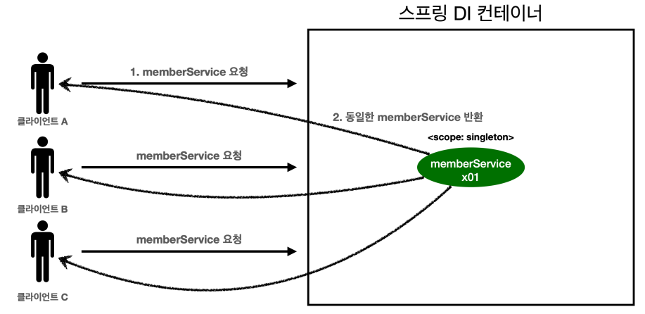 - 이후에 스프링 컨테이너에 같은 요청이 와도 같은 객체 인스턴스의 스프링 빈을 반환한다.