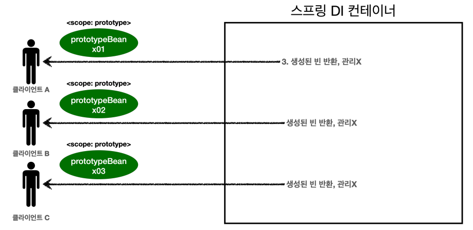 클라이언트에 빈을 반환하고, 이후 스프링 컨테이너는 생성된 프로토타입 빈을 관리하지 않는다. 프로토타입 빈을 관리할 책임은 프로토타입 빈을 받은 클라이언트에 있다. 그래서 @PreDestroy 같은 종료 메서드가 호출되지 않는다.