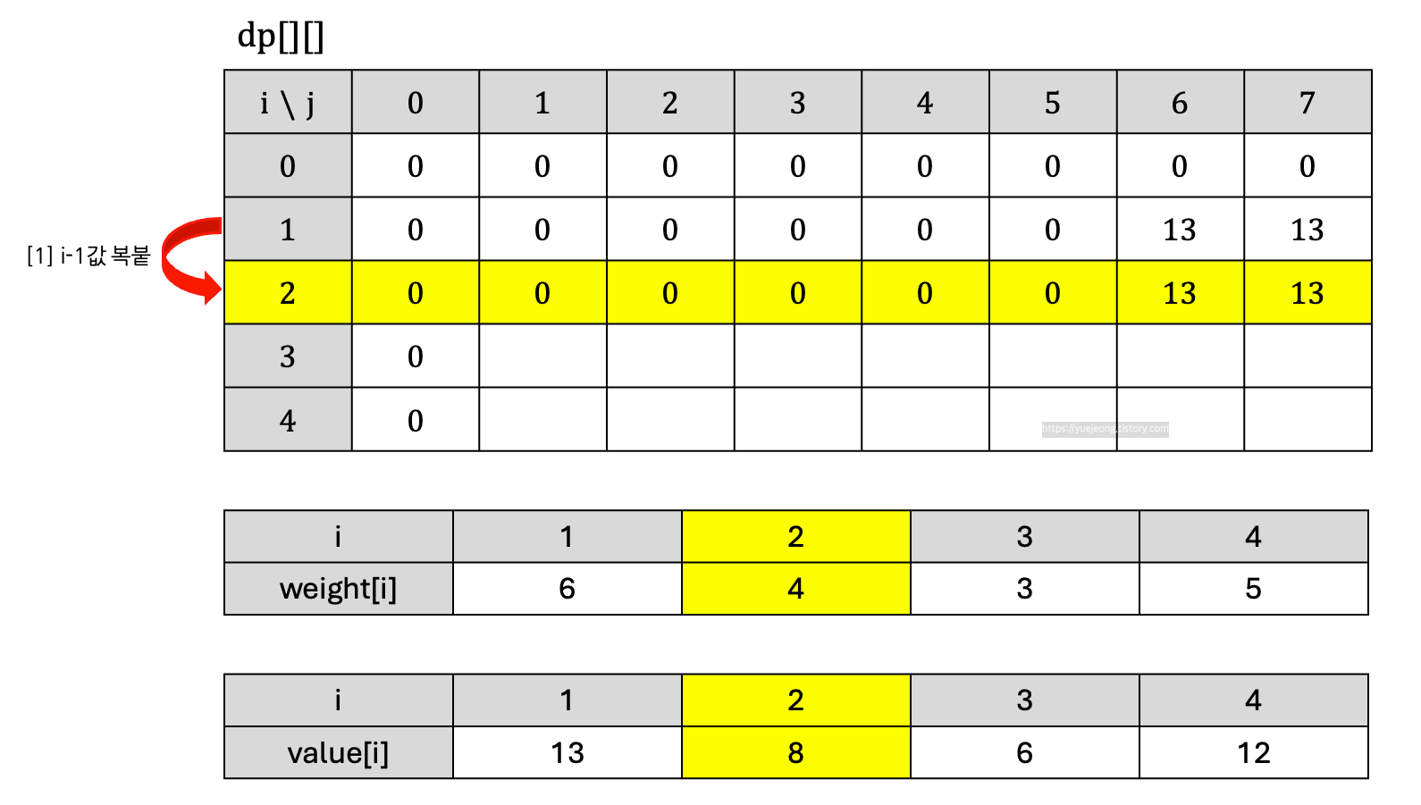 이번에는 두 번째 물건에 대해서 확인해 보자. 우선 두 번째 물건에 대해서도 dp [i-1][j] 값을 그대로 가져오는 과정이 진행된다.