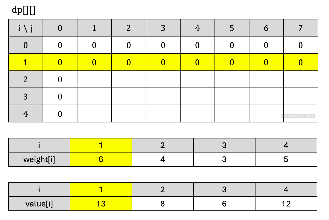 또한 weight, value 배열의 첫 인덱스는 원래 0인데 사용하지 않기 때문에 표에서 생략했다.