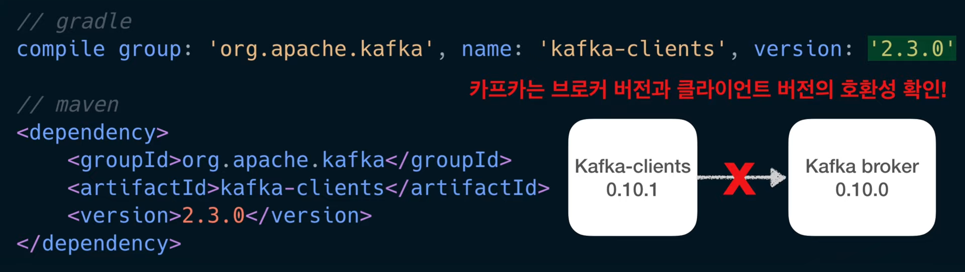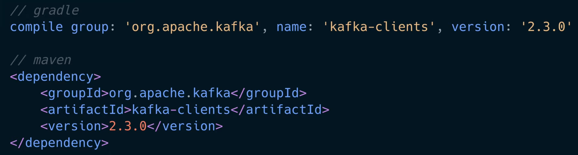 - 카프카의 프로듀서와 컨슈머를 사용하려면 아파치 카프카 라이브러리를 추가해야 한다.