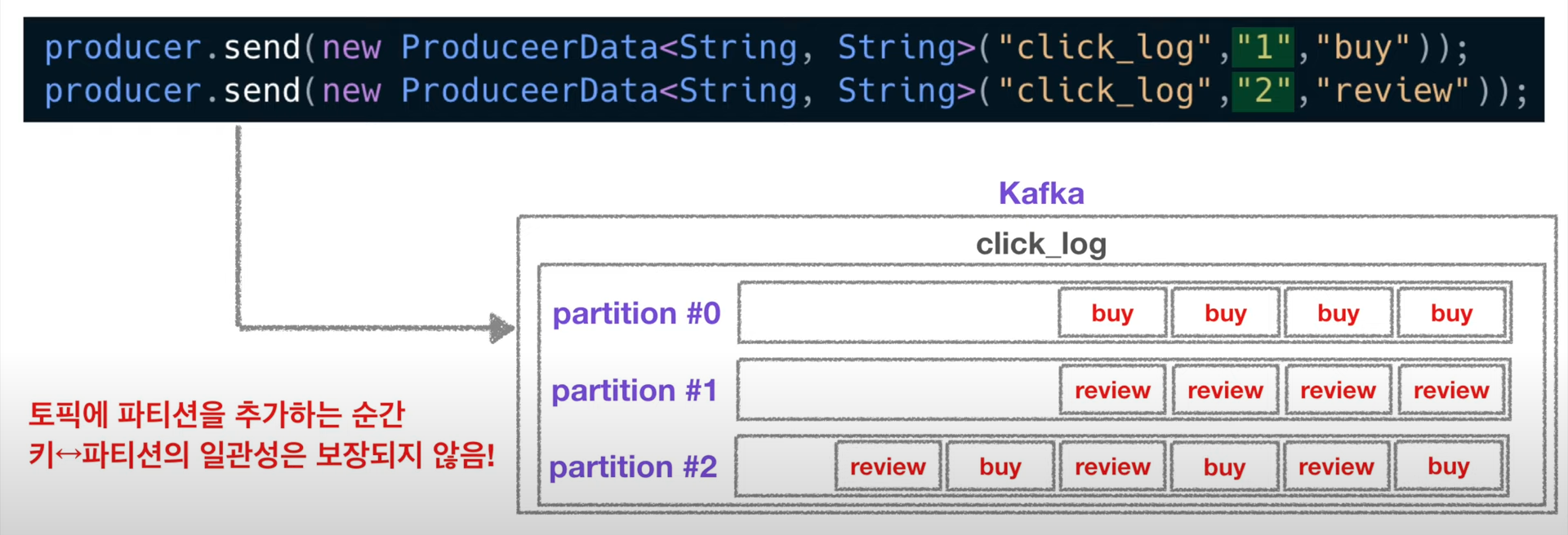 - 그러므로 키를 사용하는 경우 이 점에 유의해서 초반 파티션 개수를 설정해야 한다. 추후에 생성하지 않는 것을 추천!
