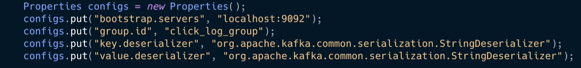- KafkaConsumer 클래스를 사용해서 이전에 선언한 properties를 매개변수로 컨슈머 인스턴스를 생성한다. 이를 통해 데이터를 읽고 처리하는 것이 가능하다.
