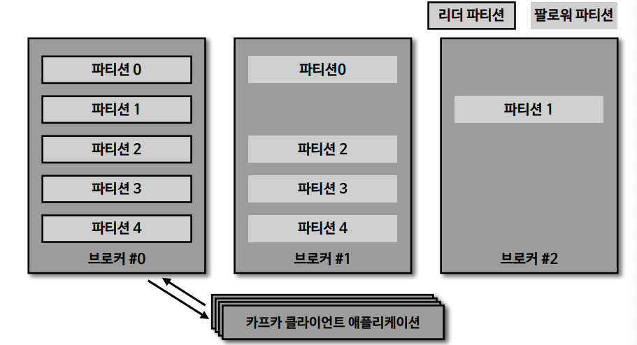 - 리더 파티션: 프로듀서/컨슈머와 직접 통신하는 파티션. 브로커에는 리더 파티션이 꼭 존재해야 한다.