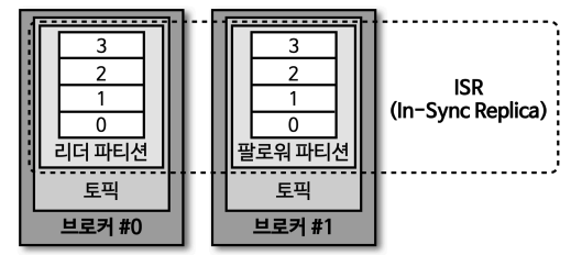 ISR: 리더 파티션과 팔로워 파티션이 모두 싱크 즉 복제된 상태