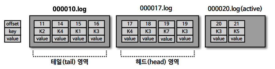 - 헤드 영역(클린 로그): 압축 정책에 의해 압축이 완료된 레코드들. 중복된 메시지 키가 없다.