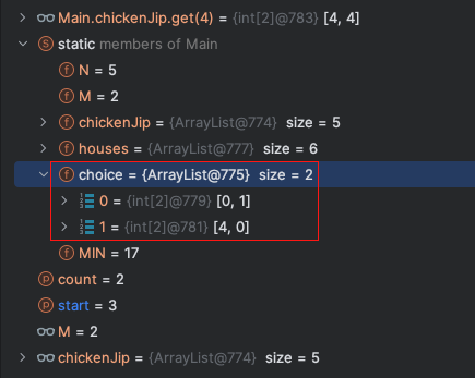 백트래킹 조합이 이해가 가지 않아서 인텔리제이의 디버거 기능을 사용해 직접 choice 배열이 갱신되어 가는 모습을 확인했다.