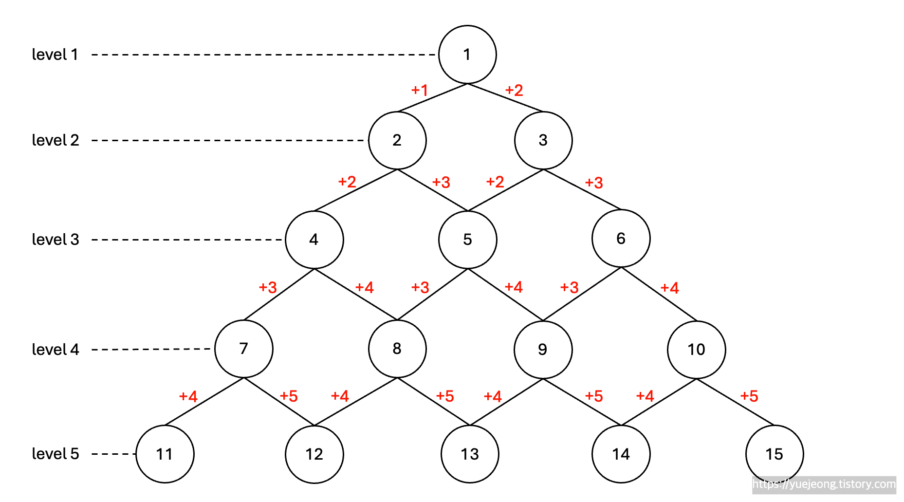 그다음엔 본격적인 dp를 하면 되는데, 여기서 자식 노드의 인덱스는 부모 노드의 인덱스에 부모의 레벨을 더하면 나온다는 것을 우리는 알고 있다. 그런데 for문을 통해서 탐색할 때, 이 레벨이 변경되는 것을 어떻게 알고 자식 인덱스를 찾아갈 수 있을까?
