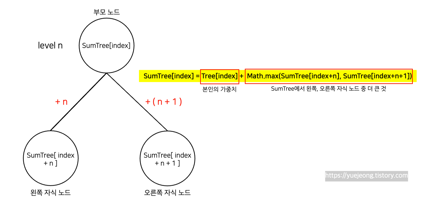 SumTree[index] = tree[index] + Math.max( SumTree[index + jump], SumTree[index + jump + 1] );