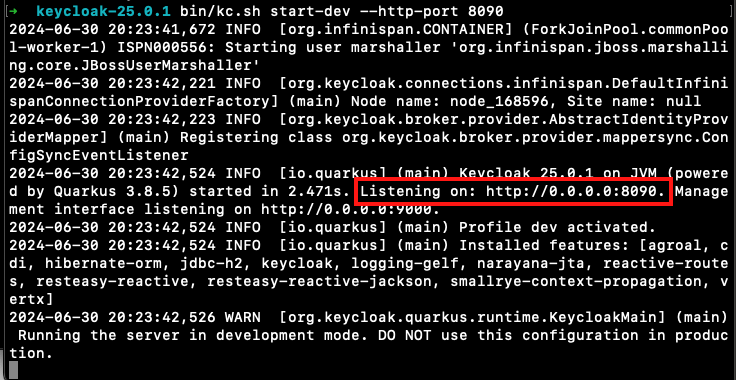 다운로드한 후, 해당 압축 파일을 해제하고, kc.sh start-dev 명령어로 키클록을 실행한다. (윈도는 kc.bat start-dev)