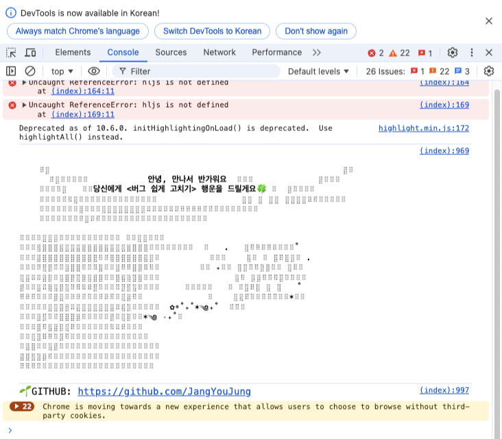 console.log('%c🌱GITHUB: https://github.com/JangYouJung',