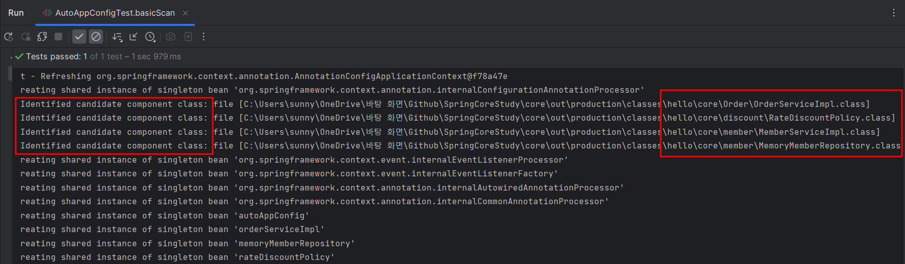로그를 보면 컴포넌트 스캔이 잘 동작하는 것을 확인할 수 있다.