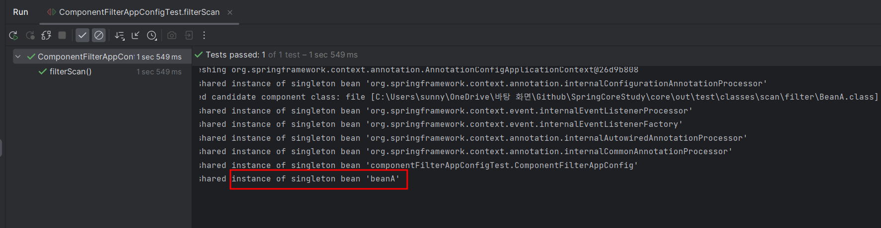 ✅ includeFilters에 MyIncludeComponent 애노테이션을 추가해서 BeanA가 스프링 빈에 등록된다.