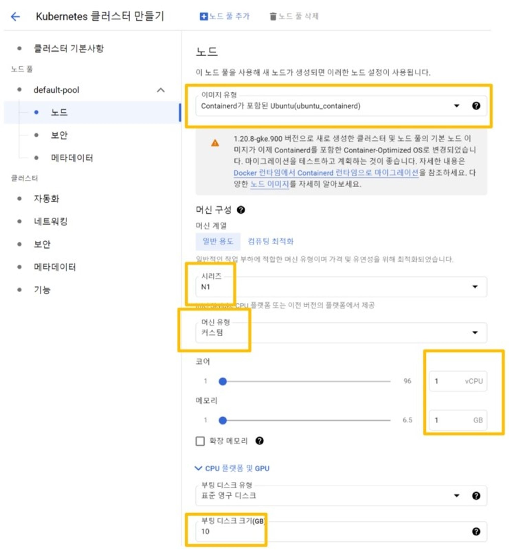 ㄷ. 노드 설정 최소 스펙: 이미지 유형(Ubuntu), 시리즈(N1), 머신 유형(커스텀), 코어 1, 메모리 1, 부팅 디스크 크기(10)
