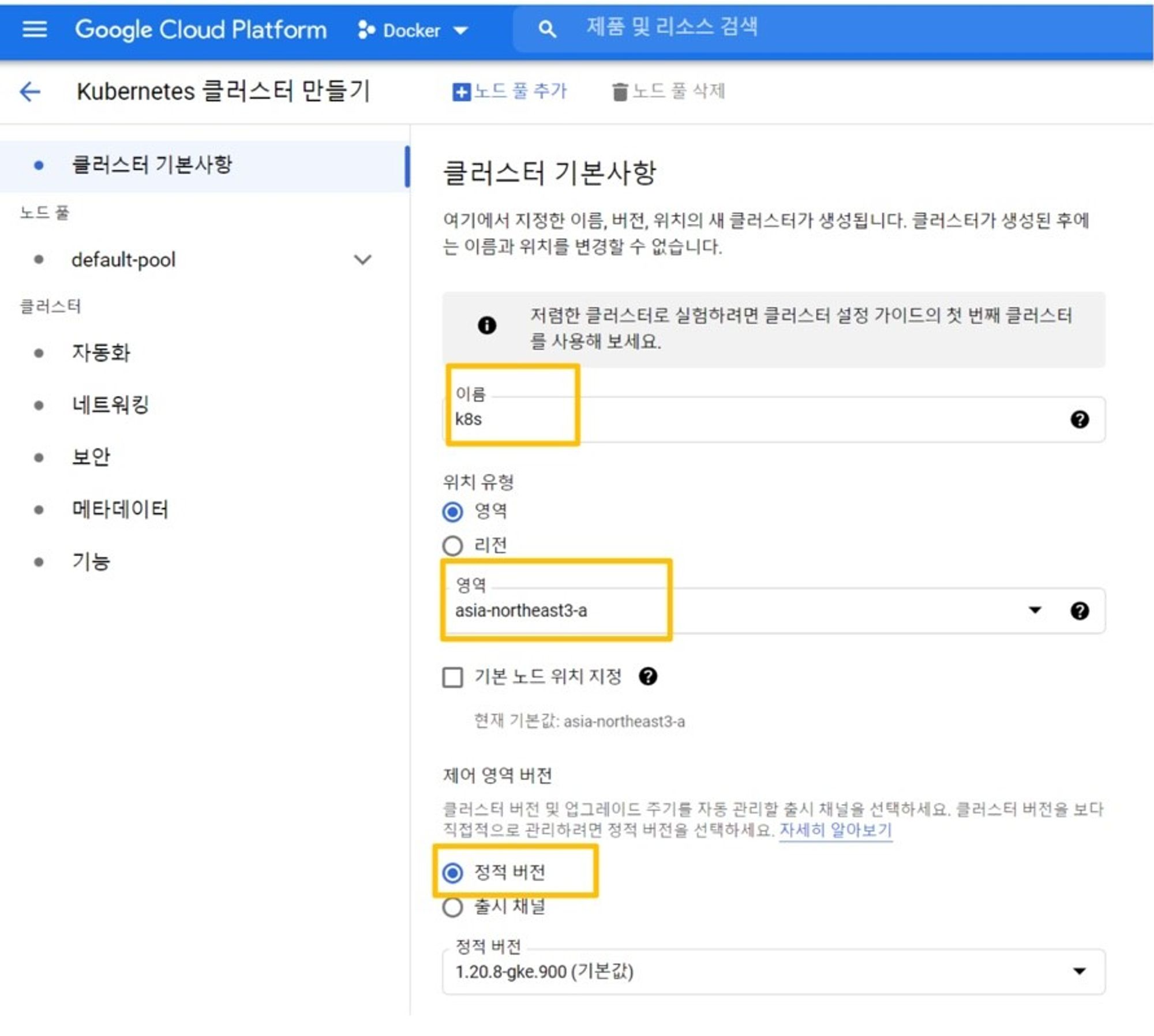 ㄴ. 클러스터 기본 사항: 리전(동북아시아), 제어 영역 버전(정적)