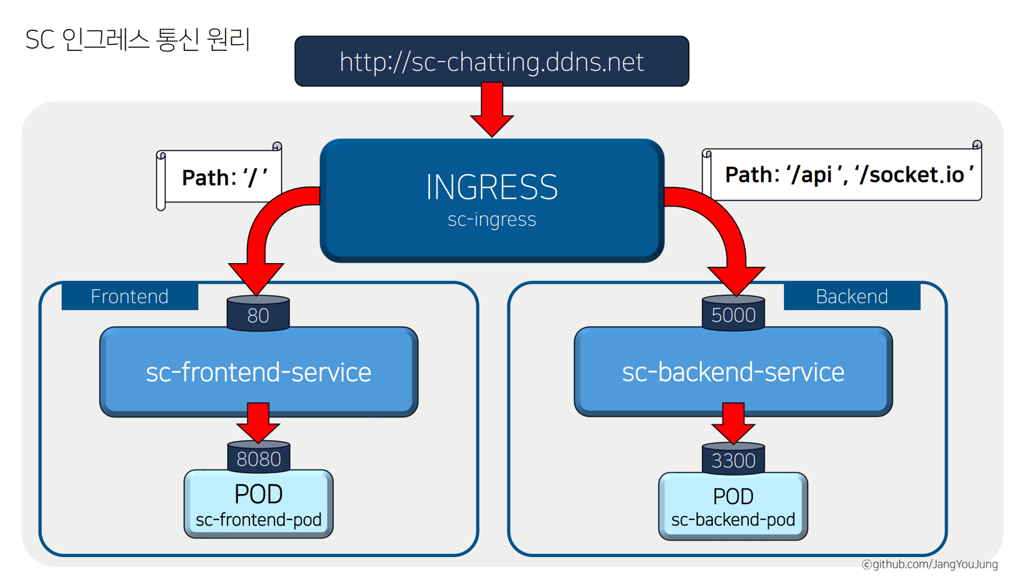 우선 외부에서 요청이 들어오면 url 경로에 따라 각 서비스 포트로 포워딩해 줍니다. ‘/’ 경로의 경우에는 80번 포트의 프론트엔드 서비스로, ‘/api’ 혹은 ‘socket.io’의 경우에는 5000번 포트의 백엔드 서비스로 포워딩해 줍니다.