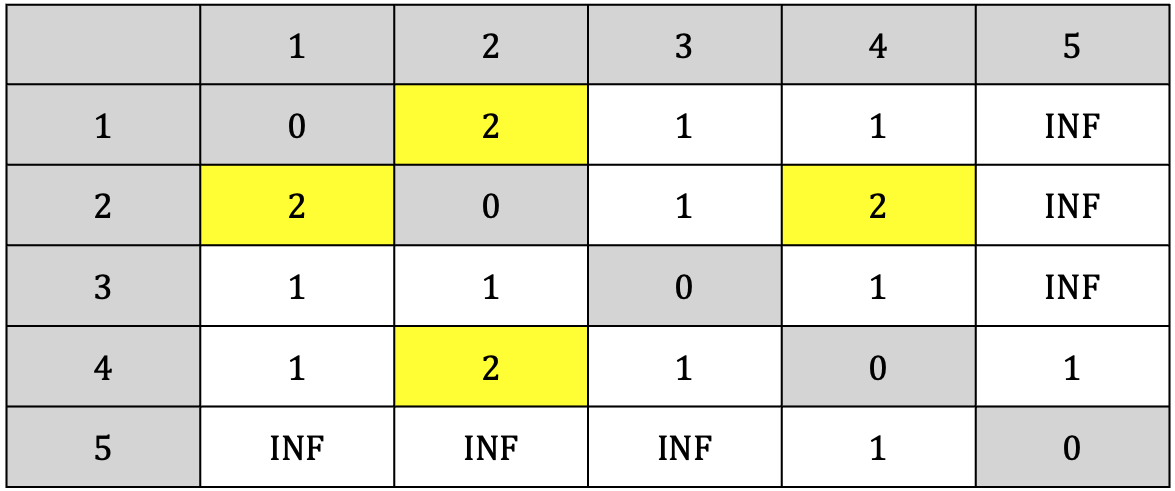 자기 자신 노드와의 단계는 0, 두 노드가 서로 직접 이어져 있다면 1, 그렇지 않은 경우에는 무한대 숫자인 INF로 초기화한다.