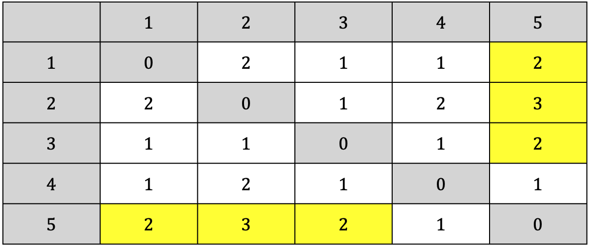 같은 방법으로 k = 4를 실행하면 표의 나머지 INF 값에 모두 갱신이 일어나 relations가 최종값을 가지게 된다. (k=5를 실행할 필요 없음)