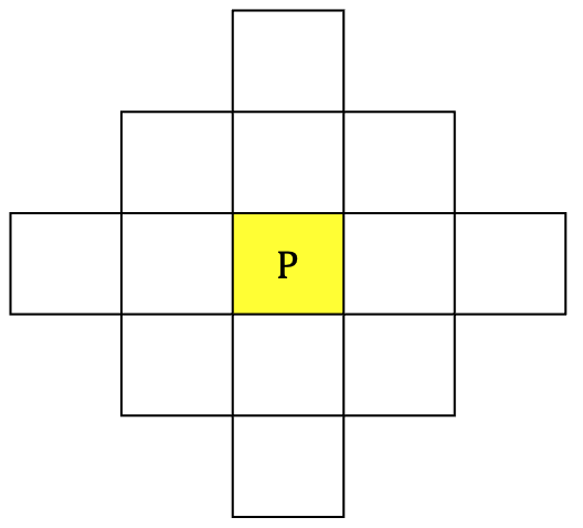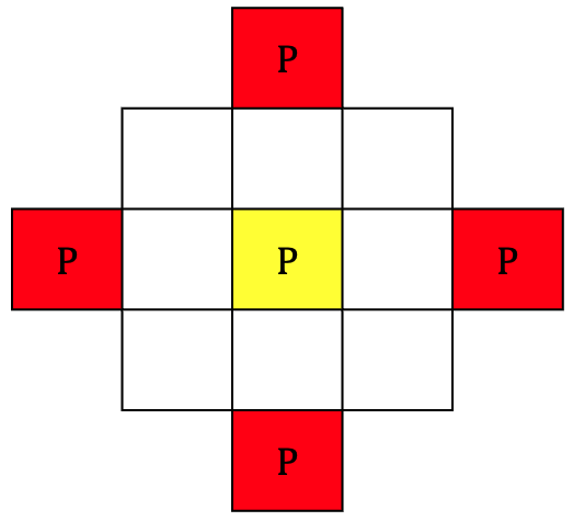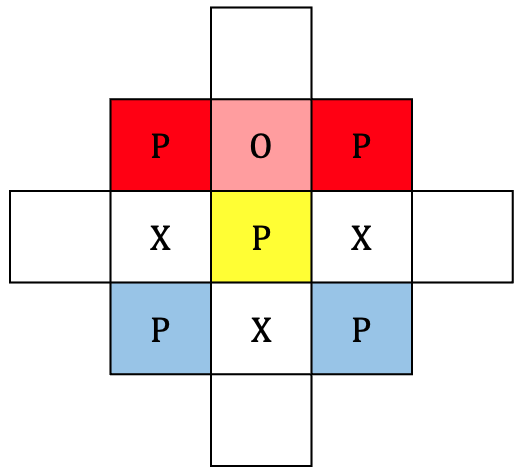 2. crossTwo: 십자가 방향으로 ds=2인 영역에서 P가 발견되는 경우