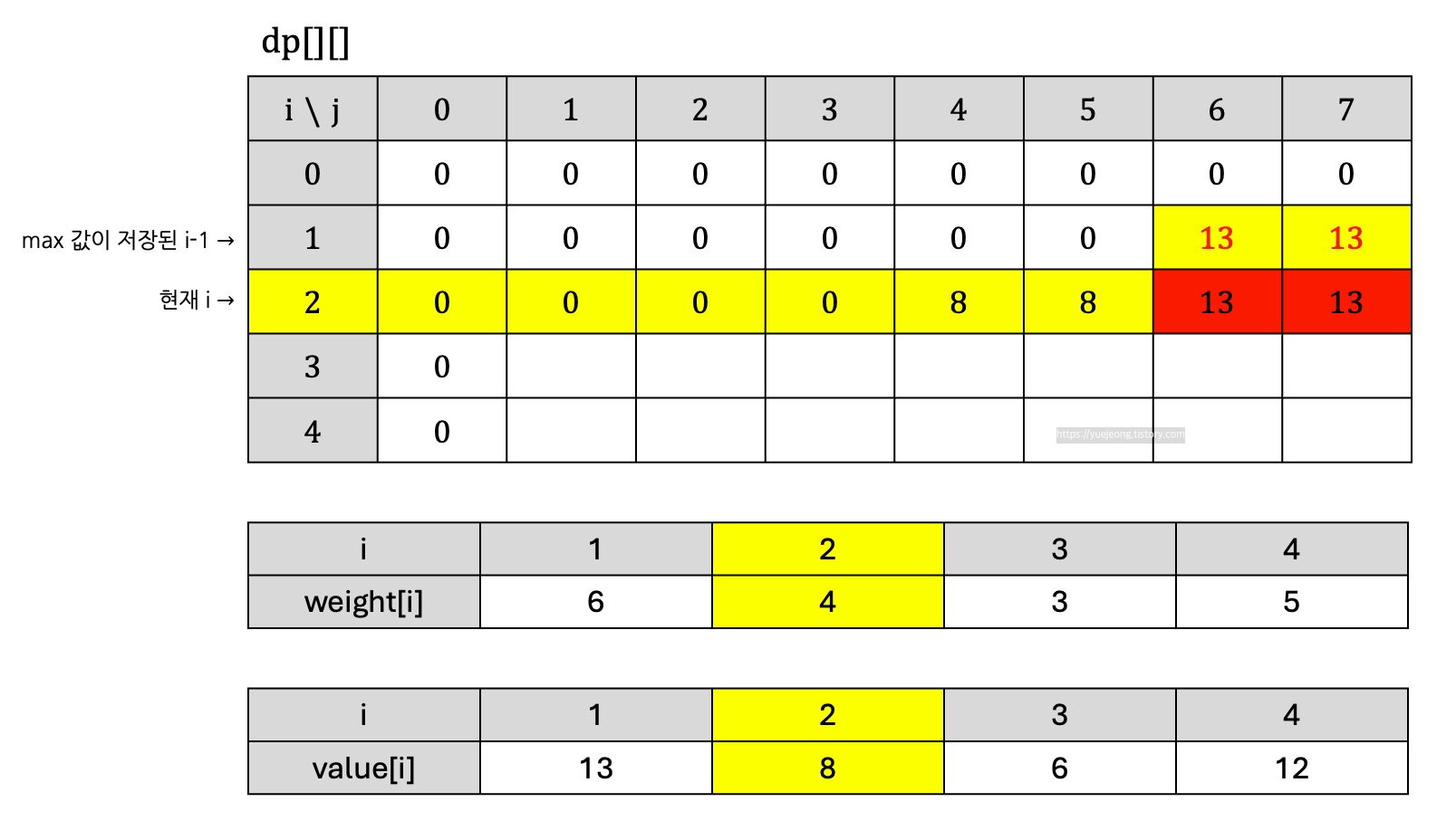 이제 j = 6일 때를 보면, 현재 물건을 담는 경우 현재 물건의 가치는 8, 6 - 4인 2의 무게일 때 최대 가치는 dp [i-1][2] 즉 0이므로 8이다. 그럼 8과 dp [i][j]를 비교해 보면 물건을 담지 않는 경우의 가치인 13이 더 크기 때문에 갱신은 일어나지 않는다. j = 7일 때도 같은 이유로 갱신이 발생하지 않는다.