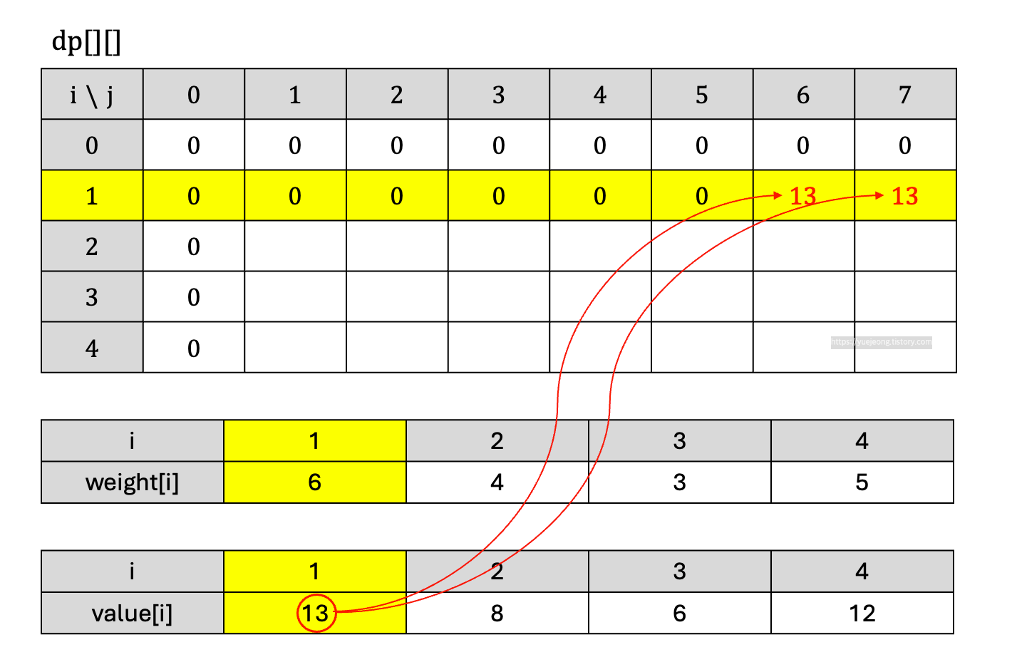 그래서 이 두 개를 비교해 보면 당연히 현재 모든 배열의 값이 0이니까 물건을 넣는 것이 최댓값임을 알 수 있다. 그러므로 갱신하면 dp [1][6], dp [1][7]에 13이 들어간다.