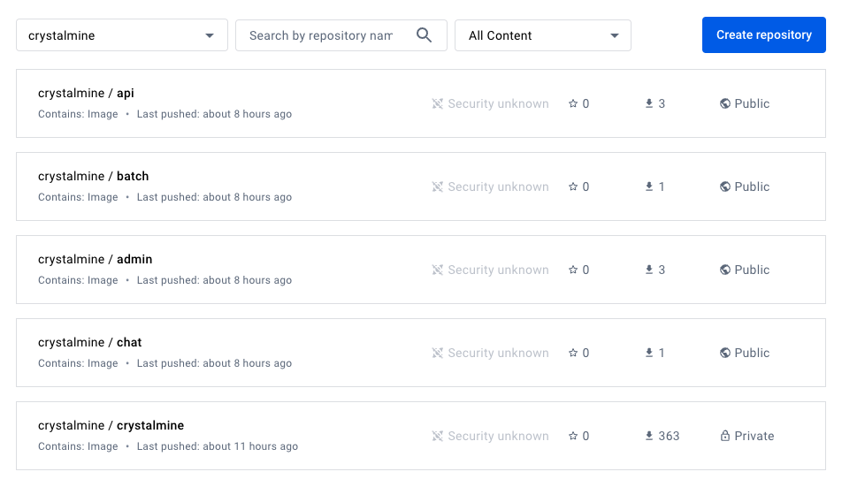 추가로 기존에는 모든 도커 이미지를 crystalmine/crystalmine 레포지토리에 한 번에 보관했는데 이렇게 되면 모든 이미지가 섞이기 때문에 무척 불편하다는 생각이 들었다. 그래서 이렇게 각 이미지마다 레포를 분리하고, 젠킨스 파이프라인에서 각 컨테이너의 이미지명을 수정했다.