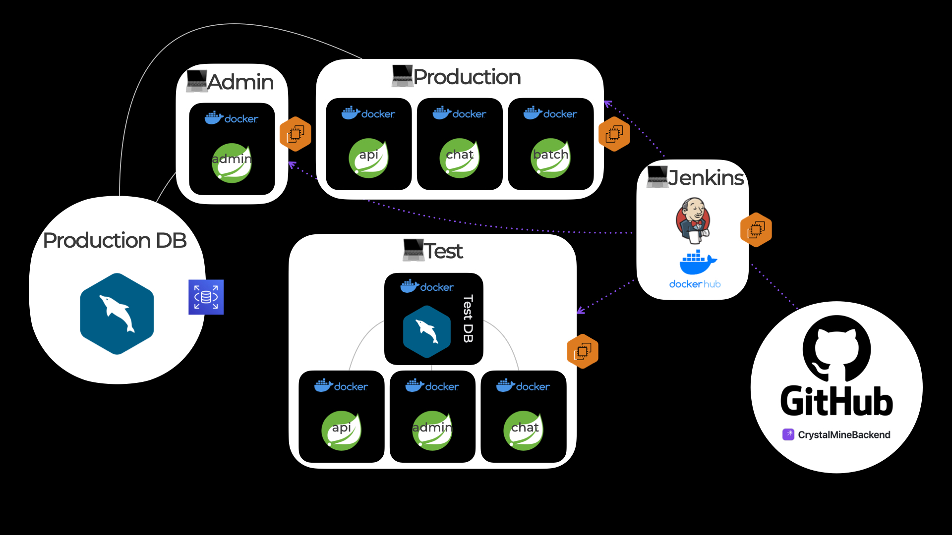 우선 우리 서버 구성은 다음과 같다. 현재 수정광산 앱에 연결된 서버는 Production서버로 AWS ec2 인스턴스 위에 api, chat, batch, 그리고 admin 도커 컨테이너가 돌아가고 있다. 원래 처음에는 어드민 도커만 올릴 서버 인스턴스를 따로 생성해서 분리했었는데, 서버 비용 부담에 커서 인스턴스 서버를 하나로 줄이고 거기에 도커를 총 네 개 올리도록 구성했다.