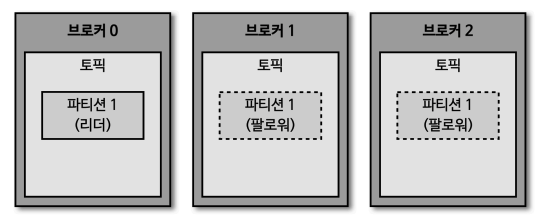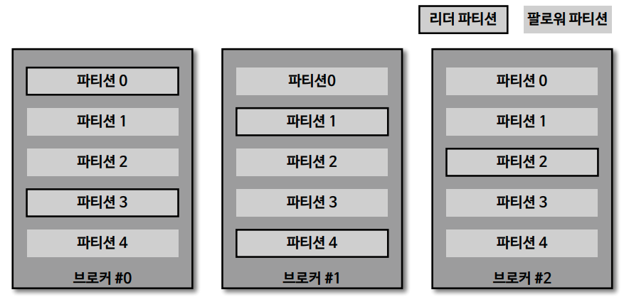 - 리더 파티션: 프로듀서/컨슈머와 직접 통신하는 파티션. 브로커에는 리더 파티션이 꼭 존재해야 한다.