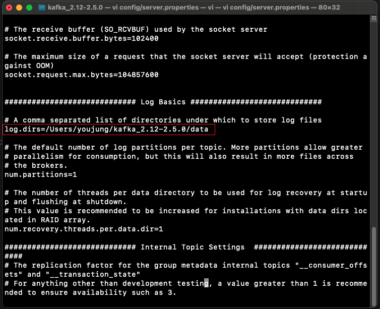 server.properties 파일에서 log.dirs에 방금 data 디렉토리를 생성한 경로로 지정해 준다.