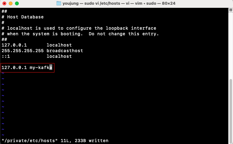 `etc/hosts` 파일에 `127.0.0.1 my-kafka` 명령어를 추가해 테스트 편의를 위한 호스트 설정을 해준다.