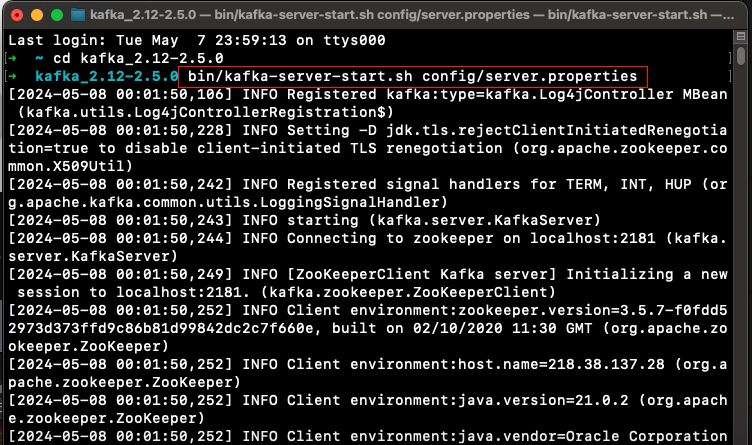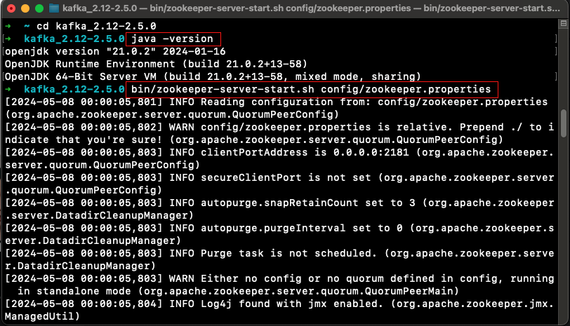 - 자바가 설치되어 있는 것을 확인했다면 `bin/zookeeper-server-start.sh config/zookeeper.properties` 명령어를 사용해서 주키퍼를 실행한다.