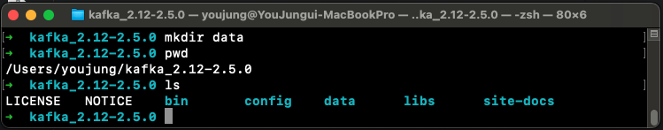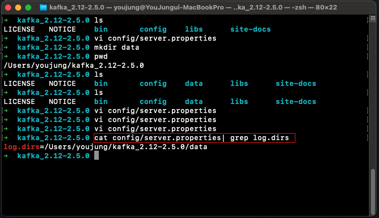`cat config/server.properties | grep log.dirs` 명령어를 입력하면 다음과 같이 올바르게 경로가 지정됐는지 확인할 수 있다.