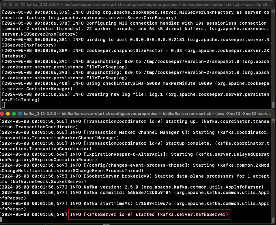- 주키퍼가 정상적으로 실행된 것을 확인한 뒤 `bin/kafka-server-start.sh config/server.properties`명령어를 사용해서 카프카 브로커를 실행한다.