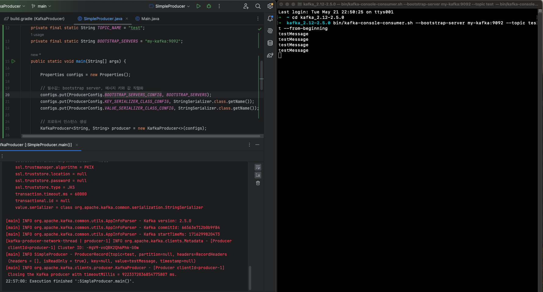 다음과 같이 코드를 작성하고 코드를 실행하면 아래와 같이 Build Successful 로그가 뜨고, acks, batch.size 등 프로듀서 정보가 나온다.